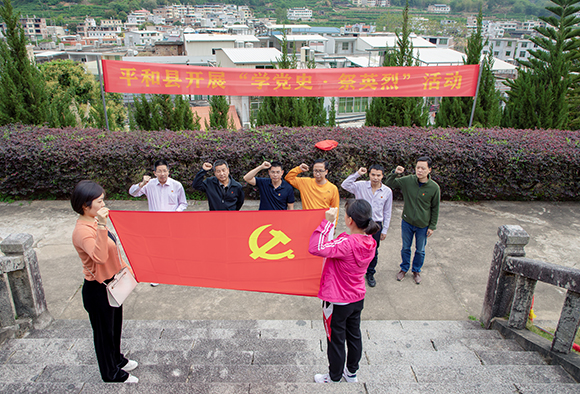 在平和暴動烈士紀念碑前,紅旗黨總支書記林玉應率全體人員向烈士紀念碑敬獻花籃,然后帶領(lǐng)全體黨員重溫入黨誓詞,回望入黨初心,接受心靈的凈化和洗禮。緊接著,在講解員羅燕軍的帶領(lǐng)下,大家參觀了平和暴動紀念館,聆聽了平和暴動歷史及朱積壘等烈士的故事。