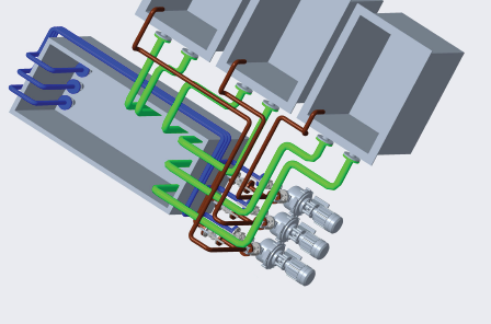 (4)施工內容:將現有CPVC鍍鉻中控系統管道更換為鈦管道,三套鍍槽溢流管路(下圖綠色管)、三套鍍槽進液管路(下圖藍色和棕色)及閥件全部更換,管路法蘭與槽溢流口法蘭以及泵連接的管道法蘭螺栓孔、中心距、螺栓須一致,循環泵及槽體為現有利舊;管道系統下面設置PVC塑料接液盤,平面長寬尺寸覆蓋管道、高度90mm。